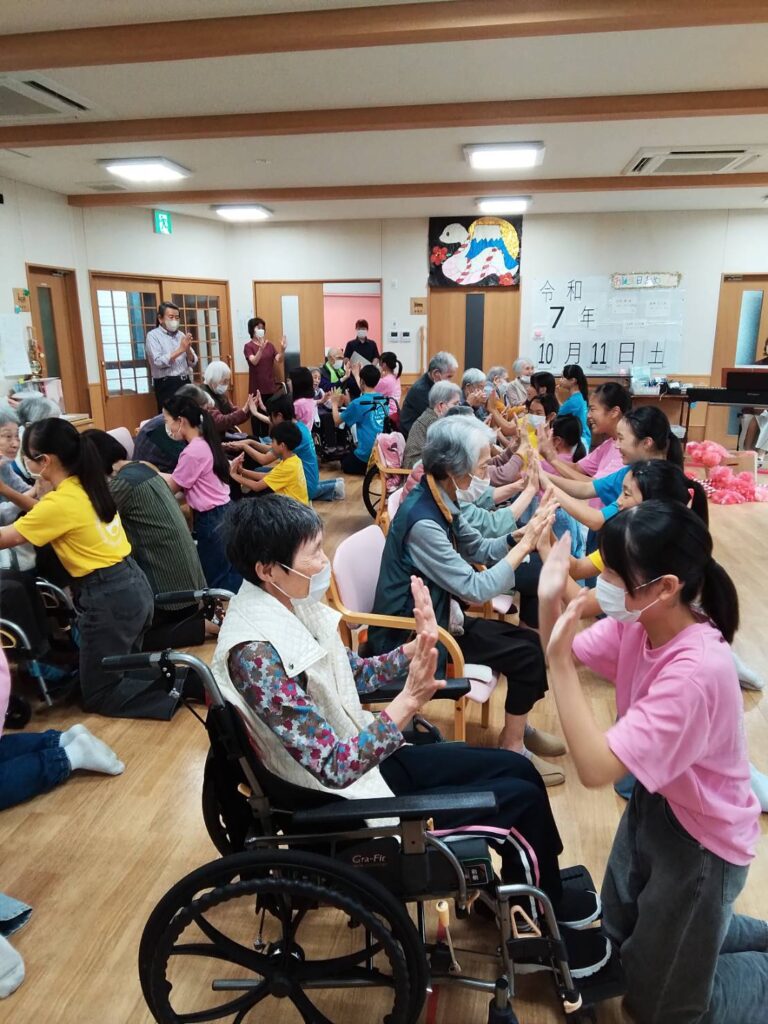 団員約30名が来訪し、入所者様約30名と手を取り合い楽しく歌いました。